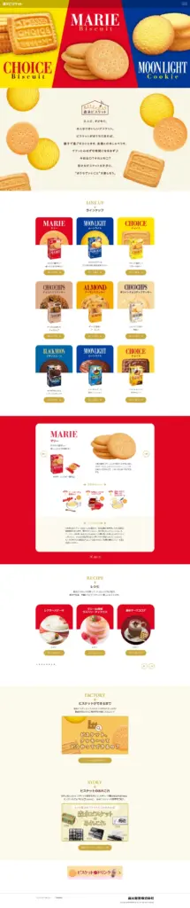 森永ビスケットのブランドページは、商品紹介やレシピ、ビスケットの歴史等が掲載されているLPです。ページを開くとビスケットが大きな画像で紹介されています。短い動画も表示されます。