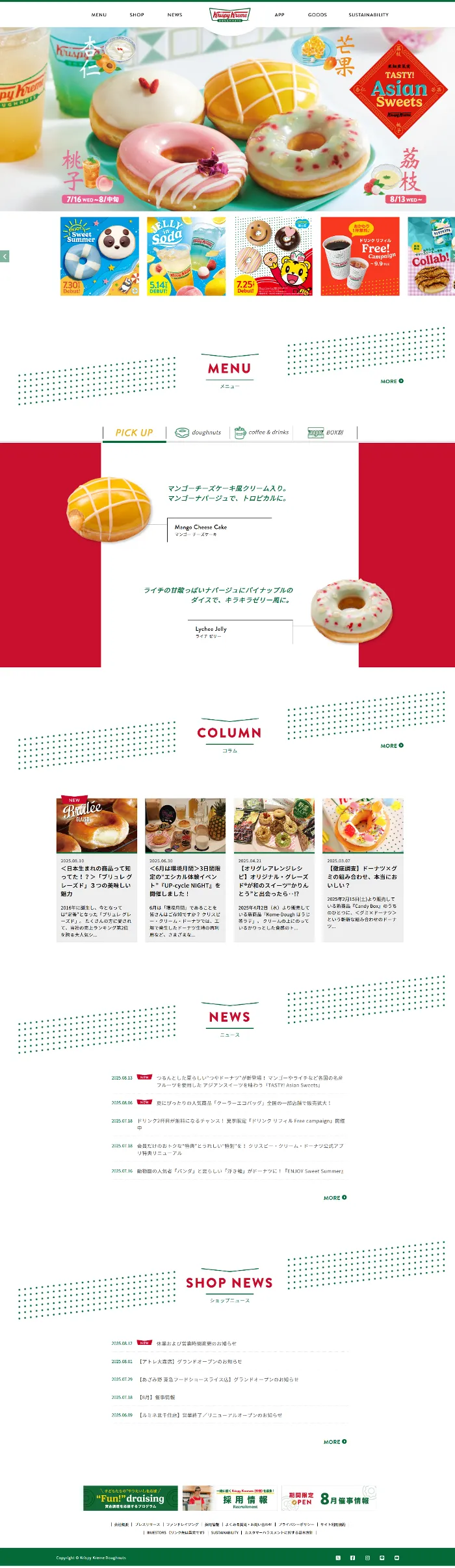 クリスピー・クリーム・ドーナツ・ジャパン株式会社のwebサイトは、スクロールすると見出しが下に動き、各内容は上に動きます。背景にドットが斜めに表示されています。サイトには、公式アプリのページへのリンクも、各ページ右下にあります。