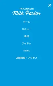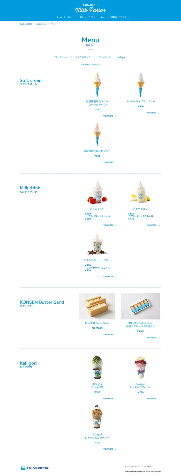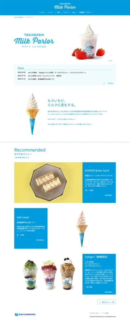 タカナシミルクパーラーのwebサイトは、水色で文字が書かれていてとても爽やかな印象のサイトです。背景にも水色が使われています。メニューページの商品がとてもおいしそうです。