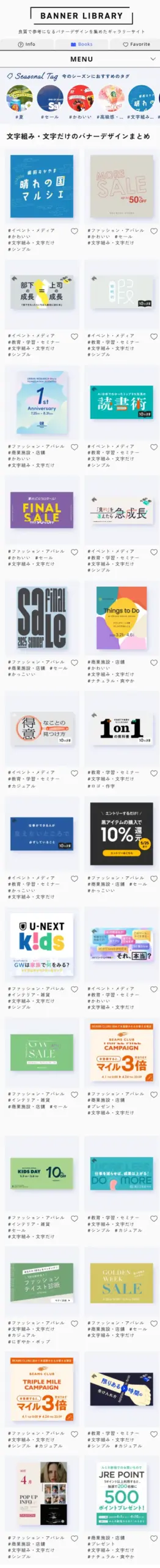 BANNER LIBRARYのwebサイトは、読みやすいフォントとシンプルなサイトカラーで、おしゃれでとても参考になるサイトです。バナーだけでは無くUIパーツ等を集めたギャラリーサイトもあります。勉強のために何度も見たいサイトです。