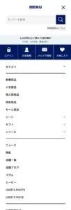 左上にハンバーガーメニューがあり、クリックすると左からMENUが開きます。カテゴリが並んでいて、ログインボタンや会員登録、メルマガ登録、お気に入りのボタンがあります。
