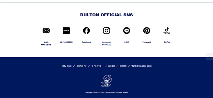 DULTONのサイトは紺の色使いが素敵なサイトです。商品の写真がとてもきれいで、サイトのトップは見やすく各コンテンツが表示されています。
