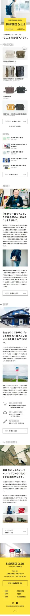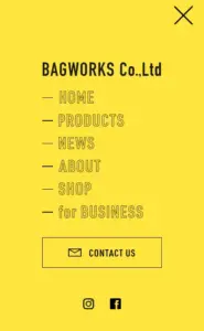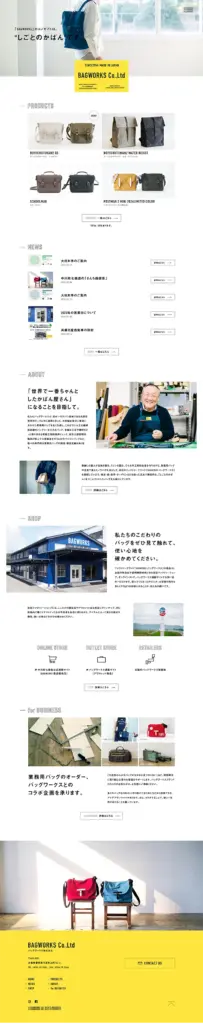 BAGWORKSのwebサイトは、サイトを開くと右から左へメインビューが表示されます。ブランド名と黄色い色の箇所が目を惹いて、きれいなメインビューが目につきます。スクロールすると縁取りをされた見出しが目に留まります。全体的に動きを取り入れたサイトです。
