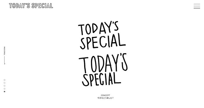 TODAY’S SPECIAL トゥデイズスペシャルのwebサイトは、開くとワンプレビューに右から左に画像が表示されます。白い背景に黒い文字のシンプルなデザインのサイトです。