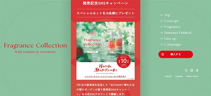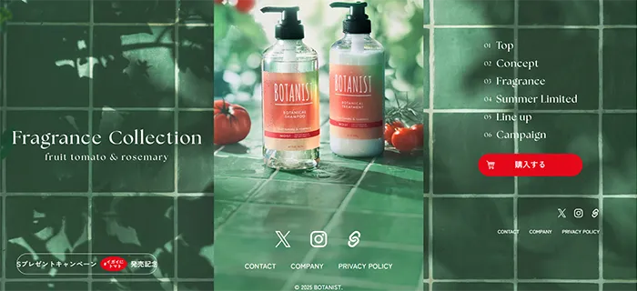 BOTANISTフレグランスコレクション’25 フルーツトマトとローズマリーの特設サイトは、商品の色が使われていて、とても画像が綺麗でお洒落なデザインのサイトです。