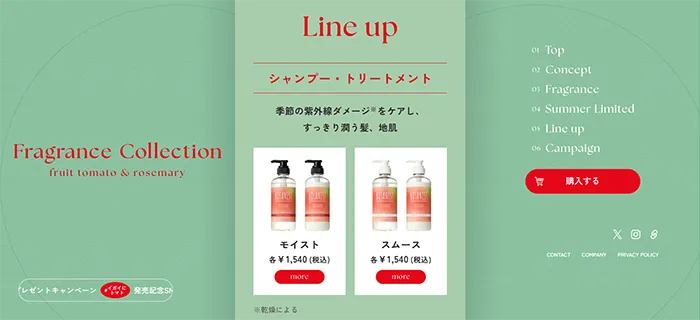 BOTANISTフレグランスコレクション’25 フルーツトマトとローズマリーの香りの特設サイトは、PCとスマートフォンが同じデザインで細い画面が表示されているサイトです。とても画像が綺麗で、トマトの赤い色を文字に利用して、トマトの画像を表示させたり、お洒落なサイトです。