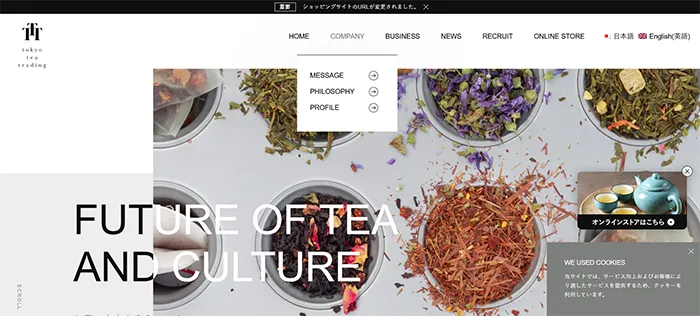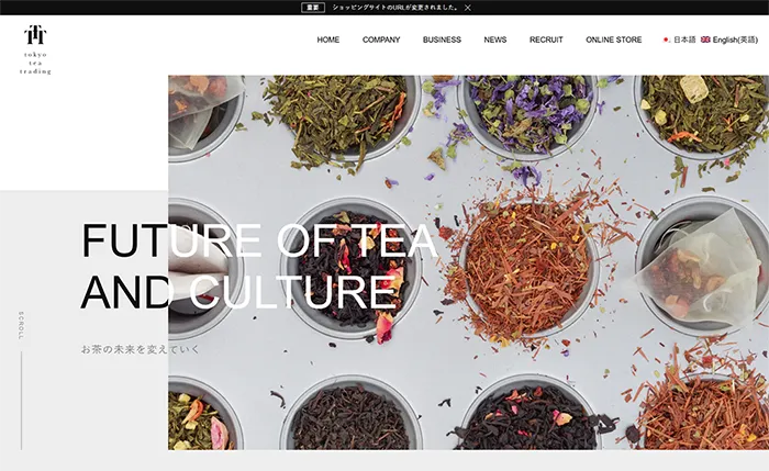 株式会社Tokyo Tea Tradingのwebサイトは、開くと大きな画像に文字が重なっていて、画像からはみ出した部分が黒文字になっていてとてもお洒落なサイトです。