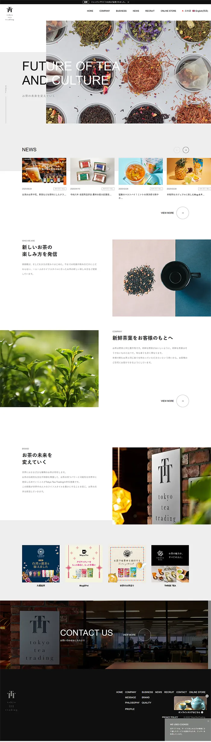 株式会社Tokyo Tea Tradingのwebサイトは、開くと大きな画像に文字が重なっていて、画像からはみ出した部分が黒文字になっていてとてもお洒落なサイトです。