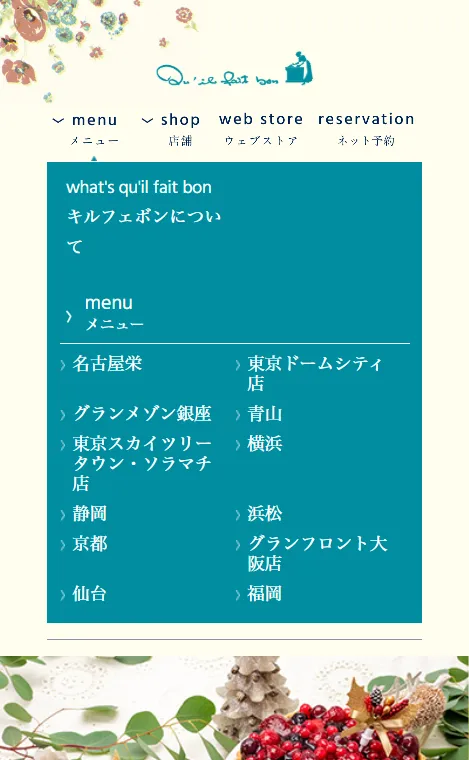 PCもスマートフォンもはヘッダーにメニューリンクがあります。クリックするとメニューとショップはアコーディオンが開きます。