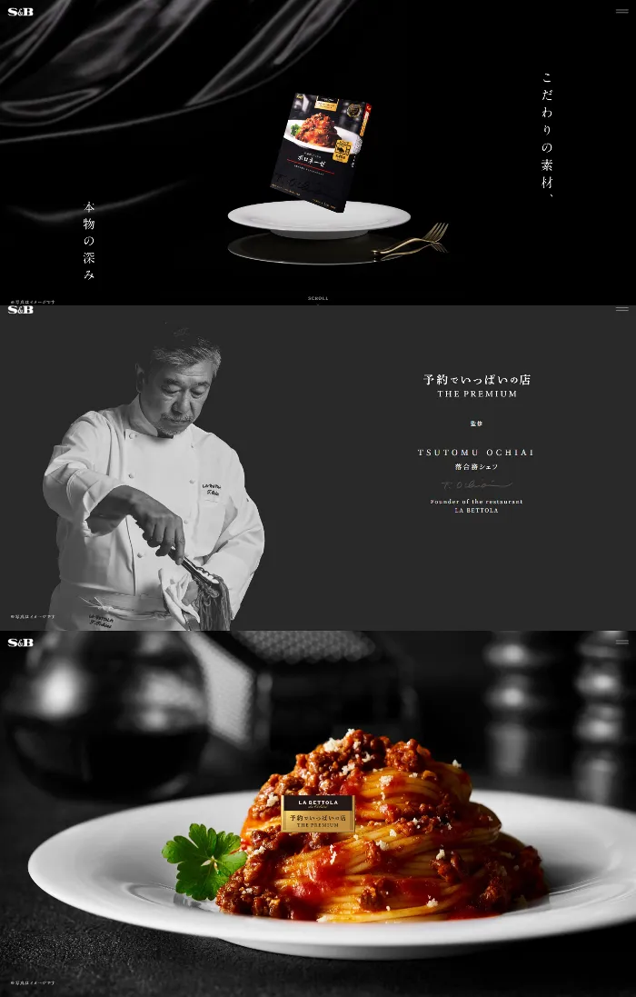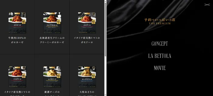 予約でいっぱいの店 THE PREMIUMパスタソースのwebサイトは、画像がとても綺麗で、商品紹介の他にもレシピの掲載もあるサイトです。見せ方から学びたいサイトです。